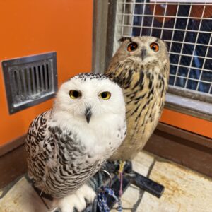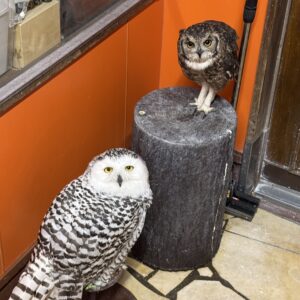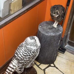 示し合わせたかのように、交互に並ぶシロフクロウちゃんとシベリアワシミミズクちゃん❣️