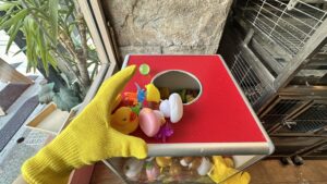 赤・黄・緑…カラフルでかわいいおもちゃがぎゅぎゅっと詰まった箱から、黄色い手袋をつけて、ワシになりきって手づかみでチャレンジ!