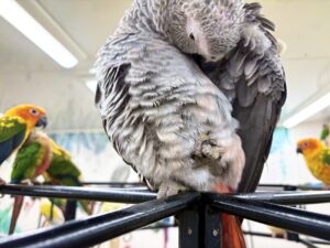 赤い尾羽が特徴のヨウムですが、この子はお腹や背中の羽にも赤い羽根が混ざり、とてもオシャレです。