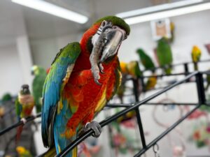 コンゴウインコの中でも存在感抜群の大きさで、緑、赤を基調とした鮮やかな色合いが美しい鳥です。
