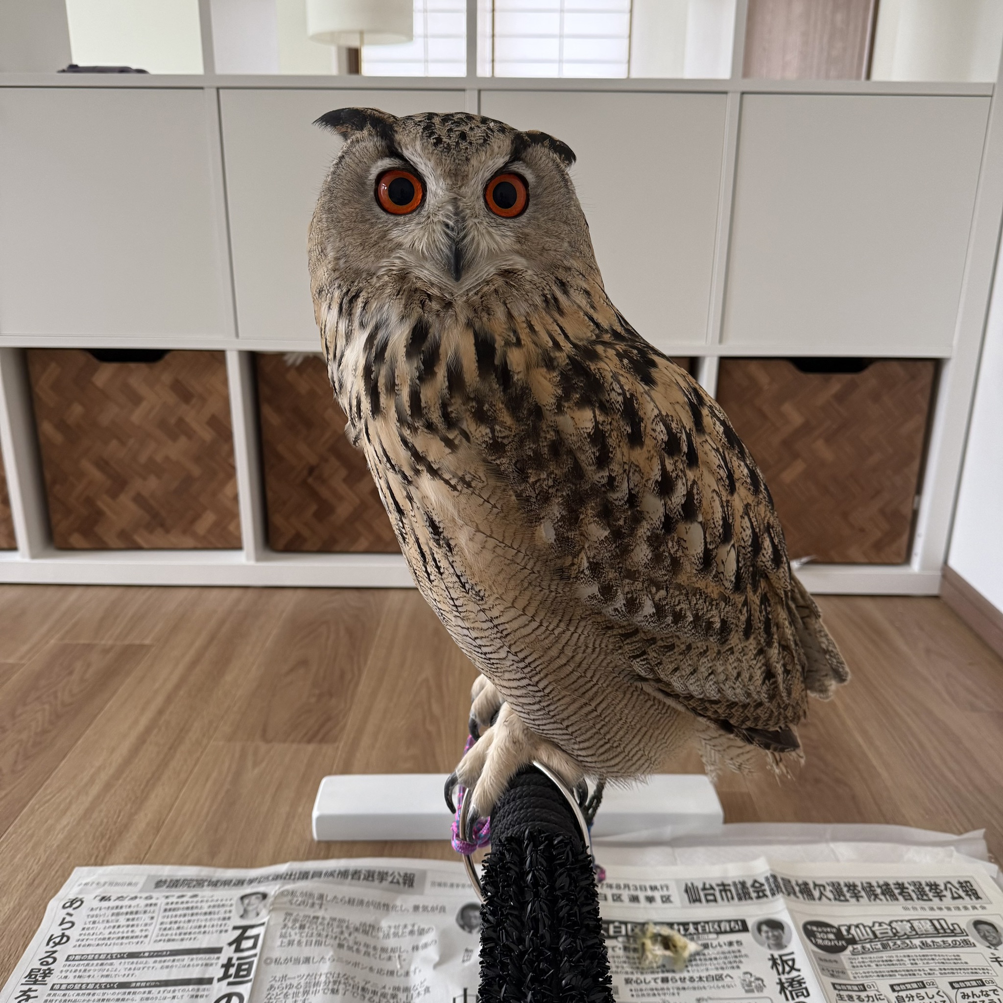 今では貫禄があります。爪切り、口ばしカットは自宅でケアしてますが普段さわると怒るのですが、この時はとてもおとなしくやらせてくれます。人間の時間帯は置物の様ですが、電気を消して暗くなると、ホーホーホッホッホッホッとかなりにぎやか、自然界の野生の森ふくろう(たぶん)とかけあいをしたりしてます。